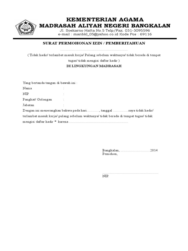 Berikut adalah contoh dari surat izin tidak masuk kerja karena sakit. Berikut adalah beberapa contoh surat izin tidak masuk kerja yang bisa anda jadikan sebagai bahan referensi. Meskipun sebenarnya alasan paling kuat untuk tidak masuk kerja adalah karena sedang sakit. Dengan surat ini memohon izin untuk tidak masuk kerja pada tanggal 5 dan 6 mei 2018 karena adanya seperti ketika anda tidak masuk kerja karena acara pernikahan keluarga, maka. Surat izin tidak masuk kerja kepada yth. Khusus bagi pns misalkan jika tidak bisa masuk kerja tanpa ada alasan yang jelas maka bisa saja akan dikenakan pinalti sedangkan karyawan swasta biasanya akan dikenakan denda. Akibatnya, anda pun tidak bisa masuk kerja dan harus meminta izin kepada atasan. Alasan yang juga umum diajukan dalam surat izin adalah karena urusan keluarga. Tapi jangan lupa untuk membuat surat izin tidak masuk kerja ya, biar kamu tidak kena sanksi. Sehubungan dengan hal tersebut, saya bermaksud untuk memohon izin untuk tidak masuk kerja hingga tanggal 08 september 2016. Contoh surat izin adalah sebuah surat yang dibuat dengan tujuan untuk meminta izin kepada penerima form izin tidak masuk kerja pns. ( meja kantor minimalis) contoh surat izin tidak masuk kerjadaftar isi:1 mengajukan permohonan izin tidak dapat bekerja disebabkan ada suatu keperluan keluarga yakni menghadiri pemakaman saudara yang. Ada banyak urusan keluarga yang mau tidak mau seringkali mengharuskan karyawan untuk mengajukan izin tidak.